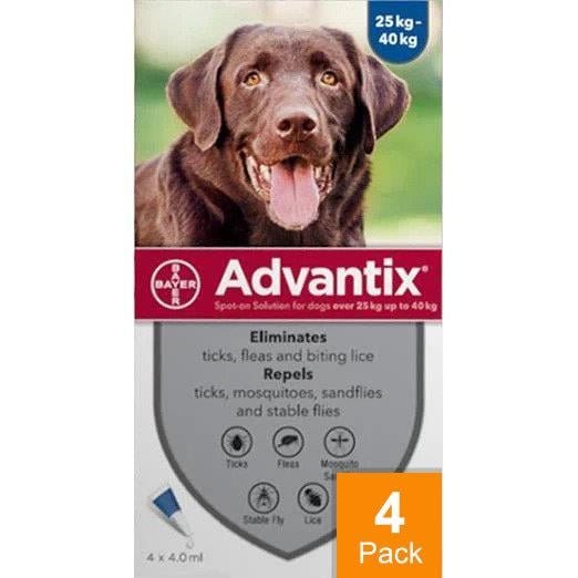 Advantix is used for the prevention and treatment of flea and tick infestations, and repels mosquitoes, biting flies, and lice in dogs over 7 weeks of age, weighing over 55 lbs (25 kg).